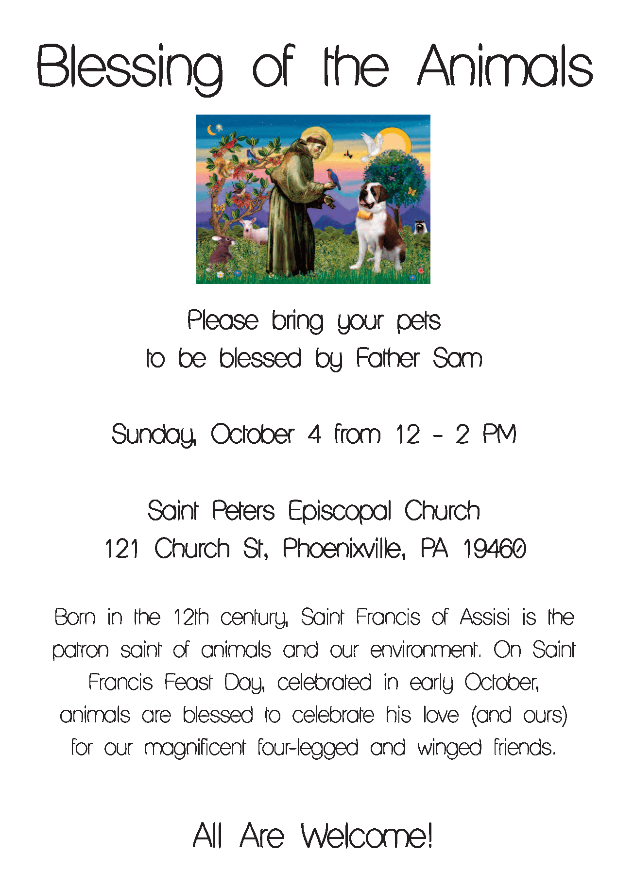 News Blessing of the Animals – Sunday, October 4th from 12-2 pm by GeMarr Hatton|Published October 2, 2020 Share this: Share on X (Opens in new window) X Share on Facebook (Opens in new window) Facebook Related